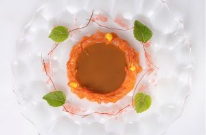 A creation based on one of the chef’s ‘fetiche sea ingredients’, with raw red prawn and an intense sauce made from its heads. The pink grapefruit – a fruit Subijana is also passionate about – provides characterful contrast.